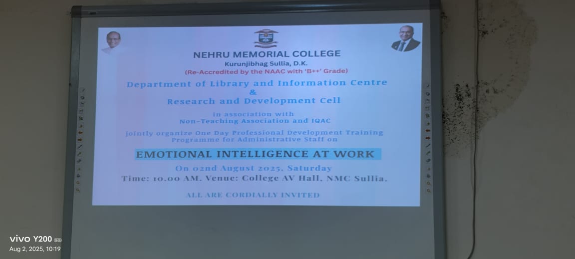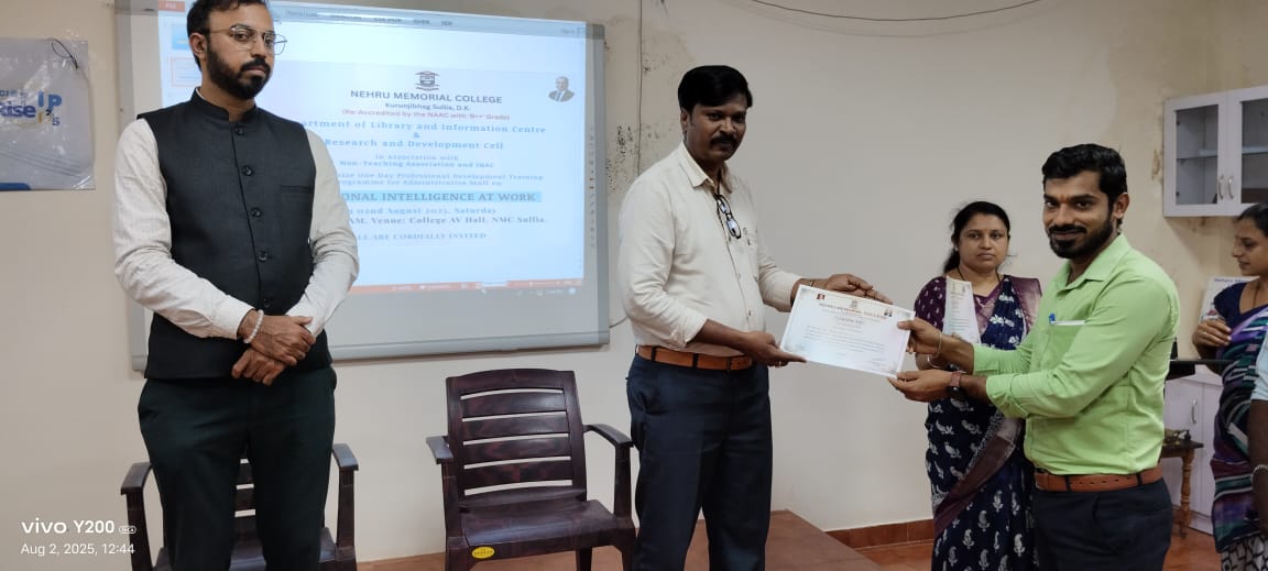 The Department of Library and Information Centre and Research & Development Cell, in collaboration with the Non-Teaching Association and IQAC, jointly organized a One-Day Professional Development Training Programme for Administrative/Non-Teaching Staff on Emotional Intelligence at Work on 02.08.2025 at the NMC AV Hall.