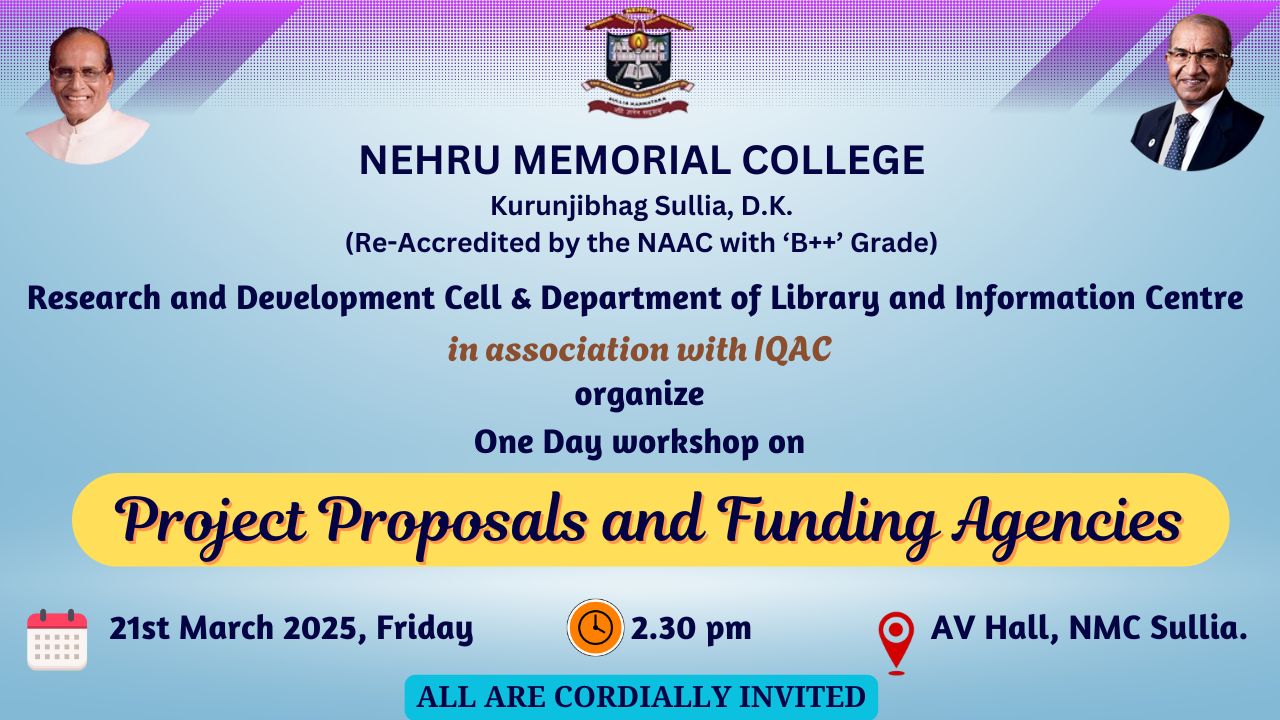 The Research and Development Cell and Department of Library and Information Centre, in association with IQAC, organized a One-Day Workshop on “Project Proposals and Funding Agencies” on 21st March 2025 (Friday) at the AV Hall, Nehru Memorial College, Sullia.
